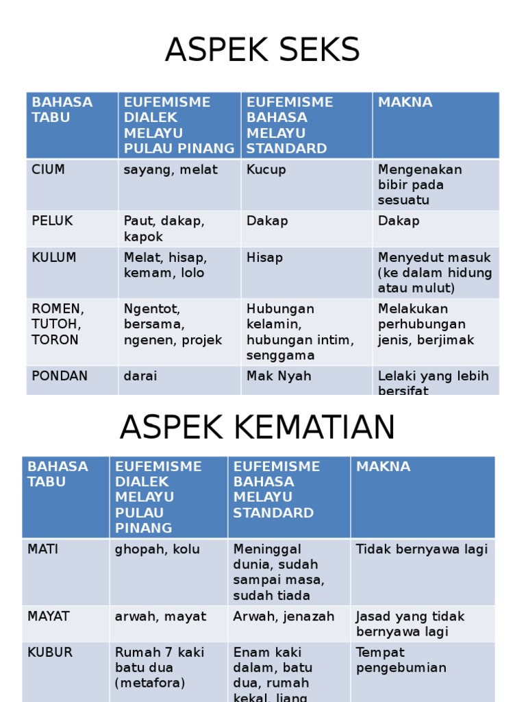 Kedua orangtuanya telah berpulang sejak sepuluh tahun yang lalu. Penelitian ini bertujuan untuk mendeskripsikan bentuk dan fungsi eufemisme dalam masyarakat Bugis. Contoh Majas Eufimisme didefinisikan sebagai bentuk ekspresi yang mengekspresikan ekspresi halus dengan mengganti ekspresi yang dianggap kasar dengan kata-kata yang lebih baik sebagai bentuk sikap yang lebih tidak sopan.
